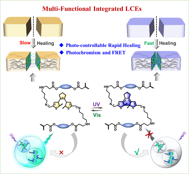 近年来,动态共价网络构筑的具有自适应功能的LCEs材料已成为先进智能材料的有力竞争者之一,其在智能驱动、传感及信息存储等领域应用前景广阔。在这项研究中,作者将光响应二芳基乙烯(DAE)基元引入到含动态亚胺键的LCE中,利用DAE光环化前后诱导亚胺键重排实现对体系自修复能力以及基于亚胺团簇的簇发光(Cluosteroluminescence, CL)强度的动态调控。具体研究结果表明,利用基于亚胺键的CL与光响应DAE的开闭环反应前后的FRET效应,实现了在365 nm UV光和525 nm绿光下LCE体系中CL的光调控。同时,DAE分子的开环-闭环引起的电子重排会对亚胺键的电荷密度和聚合物链的共价强度产生影响,从而在光刺激后加速热愈合。基于上述光控快速热修复、光致变色和FRET特性,作者展示了光控局部自修复性能在可持续信息存储材料的潜在应用。这项工作的开展对开发具有按需可定制特性的多功能LCE材料具有重要意义。