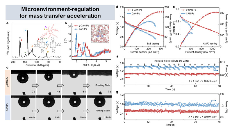 具有原子位点的非贵金属催化剂虽然在传统环盘测试中表现出了高本征活性,但是与实际应用性能之间存在显著差距。这一差距主要源于活性位点周围的微环境,亲水的催化剂表面会阻碍气体传输,严重影响反应物供应和产物排出,导致器件性能受限。基于此,本研究通过化学接枝的手段将氨基氟化的环三磷腈作为接枝剂,对聚酞菁周围的微环境进行调控,以解决酞菁大环中Fe–N₄ 位点传质困难这一关键问题。环三磷腈通过酰胺键与聚酞菁接枝,较大的空间位阻和氟化基团中 C–F 键的低表面能共同提供了低吸湿性的富集通道,从而保证了氧气向 Fe–N₄ 位点的供应并促进了羟基从催化剂分子上的脱离。此外,考虑到粘结剂的影响,本文也对g-CAN-Pc衍生的催化剂层进行了讨论,发现g-CAN-Pc/Nafion复合物的超疏水性源于缠绕的Nafion粘结剂的宏观疏水性和增强的疏水微观结构。与高孔隙率和改性化学表面相关的协同效应共同作用,使得氧气能够快速扩散通过整个催化剂层并抵达活性位点。无论是通过溶解氧供应还是从背通氧的电化学测试都表明,g-CAN-Pc表现出优于CAN-Pc的ORR性能。与传统RRDE测试中微小的性能差异相比,在ZAB和AEMFC中的器件性能得到了巨大提升,分别实现了1.4倍和2.5倍的增强。本研究提出了非贵金属催化剂的发展应更多关注于构建合理的反应场,而不仅仅是从单一活性位点去提高催化活性。