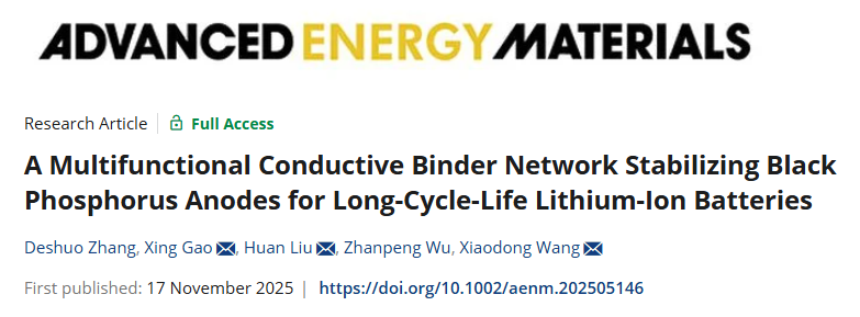 近日,北京化工大学汪晓东教授、刘欢副教授团队在国际知名期刊《Advanced Energy Materials》(IF=26)上发表了题为“A Multifunctional Conductive Binder Network Stabilizing Black Phosphorus Anodes for Long-Cycle-Life Lithium-Ion Batteries”的研究工作。