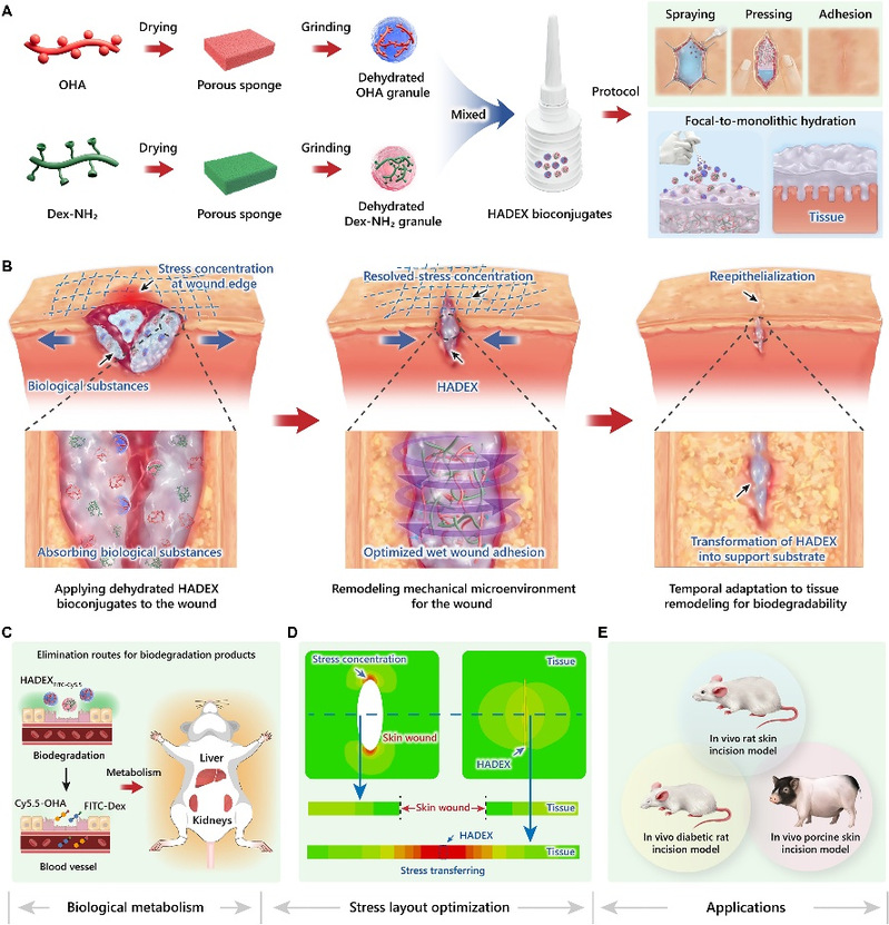 线性伤口在外科手术和慢性损伤中十分常见,但大多数研究还在用传统的圆形伤口模型,很难真实反映线性伤口特有的力学环境——尤其是伤口两端容易出现的“应力集中”现象,这往往会拖慢愈合速度。针对这一问题,研究团队开发了一种新型的湿黏附粉末系统HADEX。它由两种天然多糖衍生物组成,遇到组织渗出液后能迅速凝胶化,像一款“智能创可贴”,温柔地贴合伤口。HADEX通过动态化学键高效黏附,并借助微米级粉末快速吸收渗出液,在闭合伤口的同时,巧妙地将应力均匀分布,缓解尖端压力。更特别的是,它会随着组织自身的修复进程逐步降解,“默契配合”新组织的生长。在大鼠和猪的皮肤切口模型实验中,HADEX显著加速了伤口早期闭合和上皮再生,尤其在糖尿病伤口中也表现良好。它使用简便,有望成为新型创面敷料,为患者带来更舒适、更高效的无缝愈合体验。