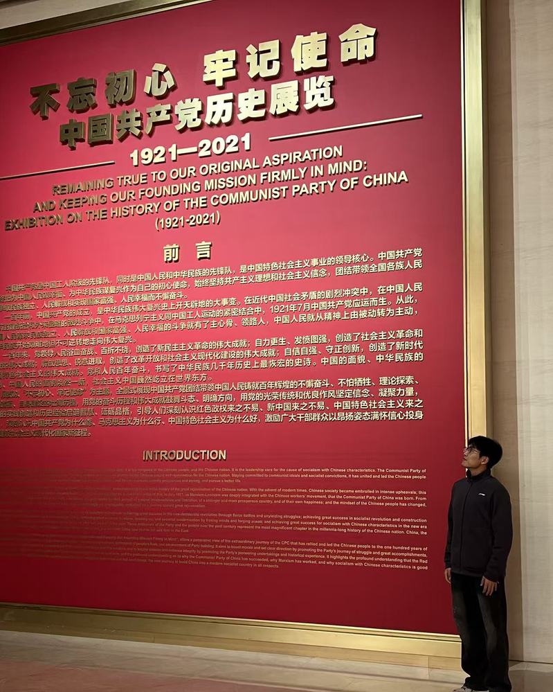 全体成员怀揣着崇敬与期待之情抵达了中国共产党历史展览馆。在庄严的场馆内,大家沿着“建立中国共产党 夺取新民主主义革命伟大胜利”、“成立中华人民共和国 进行社会主义革命和建设”、“实行改革开放 开创和发展中国特色社会主义”、“推进中国特色社会主义进入新时代 全面建成小康社会 开启全面建设社会主义现代化国家新征程”的展览脉络,进行了系统而深入的参观学习。参观过程中,大家透过一幅幅珍贵的历史图片、一件件斑驳的实物展品、一段段详实的文献资料、一幕幕逼真的复原场景,深刻感悟中国共产党为中国人民谋幸福、为中华民族谋复兴的初心使命,真切体会党带领全国各族人民历经艰难险阻、取得辉煌成就的奋斗历程。入党积极分子和团员们仔细观看,深刻认识到坚持党的领导是历史的选择、人民的选择,进一步坚定了向党组织靠拢的决心。