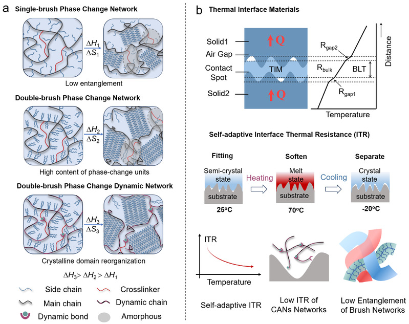 近日,我校材料科学与工程学院张军营教授、程珏教授团队在国际知名期刊Advanced Science上发表题为“Record-High Latent Heat, Ultra-Fast Relaxation and Closed-Loop Recycling Double-Brush Polymer Networks for Self-Adaptive Thermal Interface Management”的研究论文。该工作成功设计并制备出一种兼具高潜热、超快弛豫能力与闭环回收特性的双刷结构相变聚合物网络,为解决人工智能时代高功率芯片的散热难题提供了新材料解决方案。