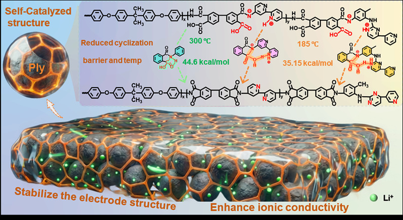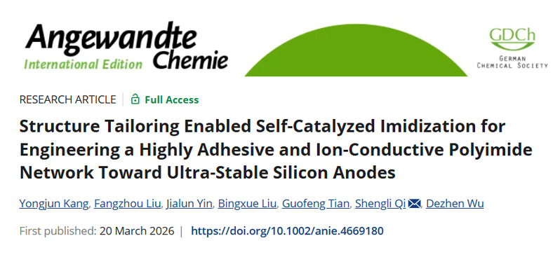 近日,北京化工大学材料科学与工程学院齐胜利教授团队在《Angewandte Chemie International Edition》上发表了题为“Structure Tailoring Enabled Self-Catalyzed Imidization for Engineering a Highly Adhesive and Ion-Conductive Polyimide Network Toward Ultra-Stable Silicon Anodes”的研究论文。通过自催化实现低至185 ℃的聚酰亚胺亚胺化,突破传统300 ℃高温工艺难题,为硅基负极的超长循环稳定提供了新策略。