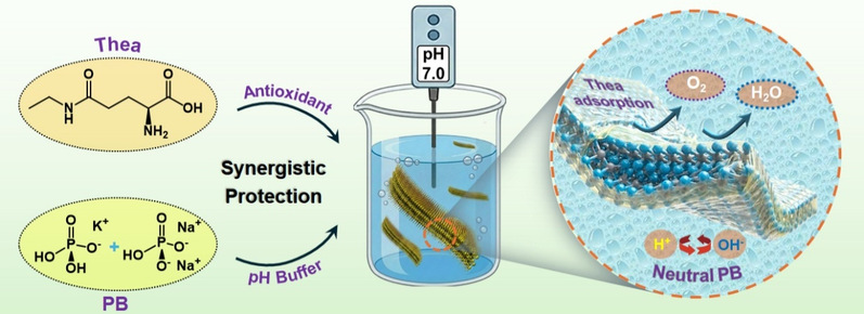 近日,北京化工大学材料科学与工程学院徐斌教授、樊保民副教授团队在腐蚀领域国际权威期刊《Corrosion Science》上发表了题为“Long-term aqueous stability of Ti3C2Tx MXene achieved via a synergistic corrosion inhibition strategy”的研究性论文。该工作从腐蚀理论出发,基于协同缓蚀原理,利用L-茶氨酸(Thea)作为高效缓蚀剂,并结合中性磷酸盐缓冲液(PB)来调节水性介质的pH值,实现了MXene分散液的长期稳定存储。